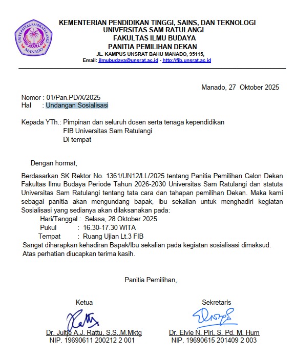 Undangan Sosialisasi Tahapan Pemilihan Dekan Fakultas Ilmu Budaya Periode 2026-2030